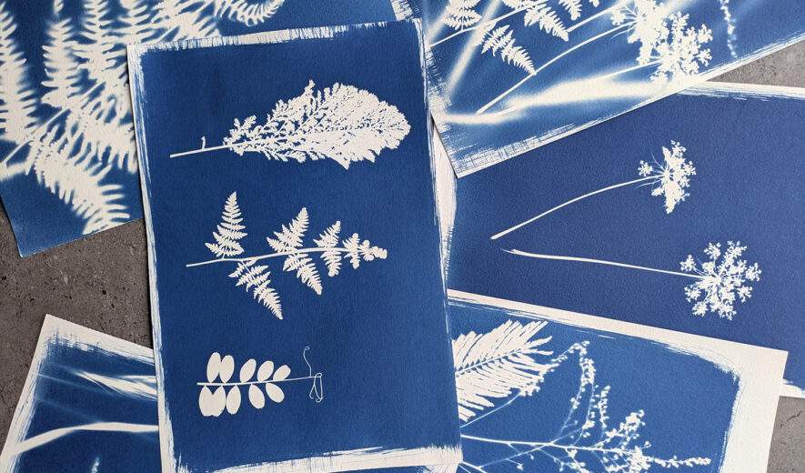 Le cyanotype est un procédé découvert au milieu du XIX° siècle. Il permet de réaliser des tirages photographiques de couleur bleue de Prusse à partir de négatifs, ou des photogrammes à partir de plantes ou d’objets.