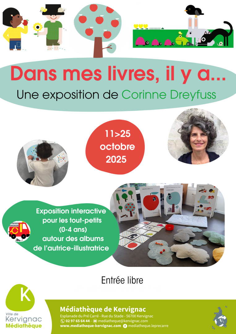 La médiathèque de Kervignac a le plaisir de programmer l’exposition pour les tout-petits « Dans mes livres, il y a … » conçue par l’autrice-illustratrice Corinne Dreyfuss autour de ses albums. Elle a été pensée et réfléchie à hauteur d’enfants. Les enfants peuvent l’explorer tous leurs sens en éveil : observer des images, toucher, jouer, écouter, expérimenter, créer, entrer tout entier et les yeux grands ouverts dans l’univers des livres de Corinne Dreyfuss. Une belle exposition, parsemée d’allers-retours entre l’écrit, le jeu, le corps, l’image, le mouvement, l’objet livre, les sens, le langage... à parcourir en famille !