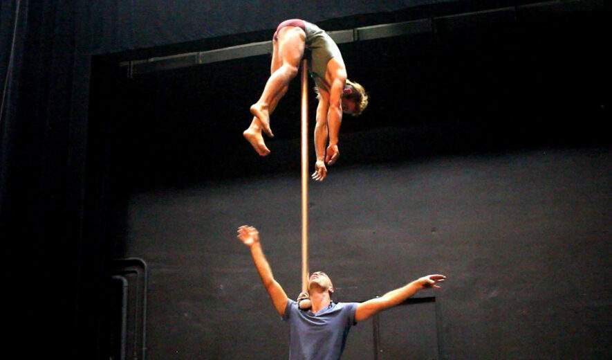 Mais quand vingt ans plus tard tu te retrouves la tête à l’envers, sur un bout de métal, en équilibre sur l’épaule de ton pote, à 7 mètres de haut, devant 200 personnes qui te paient pour le faire, tu te poses des questions.