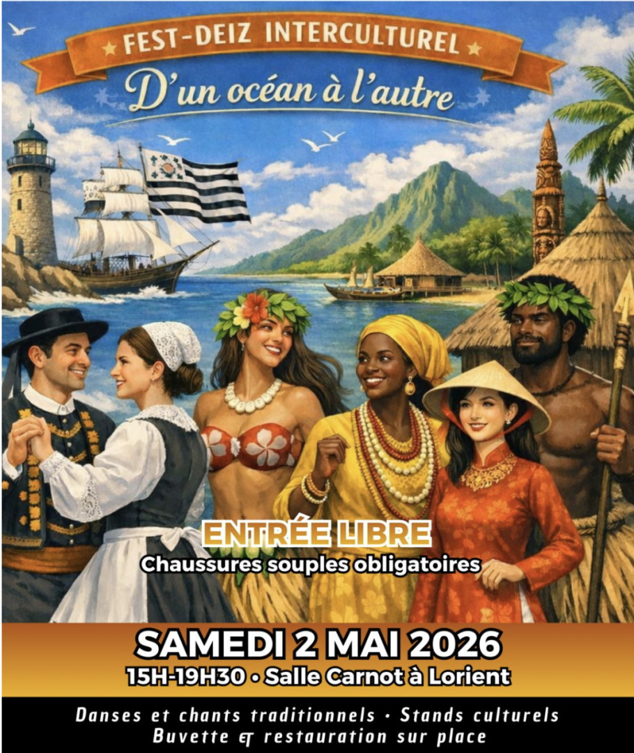Le samedi 2 mai 2026, de 15h à 19h30, la Salle Carnot accueillera un Fest-Deiz interculturel qui dépasse le simple cadre festif. D’un océan à l’autre est une invitation à faire société, à faire se rencontrer des histoires, des mémoires et des pratiques culturelles qui, ensemble, dessinent un avenir partagé.