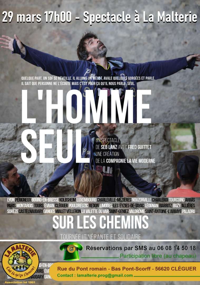 Dans sa pièce « L’homme seul », Seb Lanz met en scène Fred Guittet qui articule sous le prisme de l’histoire de sa vie les témoignages de mendiants qu’il a rencontrés lors de maraudes dans les rues de Lyon. Cet homme seul est le Saint François d’Assise du roman de Christian Bobin, le Très Bas, dépouillé de tout, philosophe intérieur. Pas par choix, non. Il est un accidenté de la vie et il a choisi d’assumer, de donner de la noblesse à son existence ; on peut être très beau dans la déchéance. Avec comme compagnie ses roublardises et ses canettes, son banc et surtout sa philosophie, il nous amène dans cet univers que l’on sent aussi riche que pauvre, aussi violent que poétique, cruel mais vrai.
