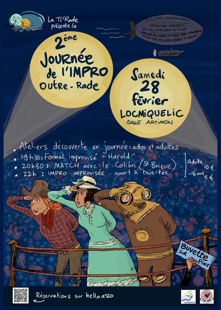 Rendez-vous le samedi 28 février 2026 à la Salle Artimon de Locmiquélic. Vous y trouverez des ateliers en journée pour la découverte du théâtre d'improvisation et une soirée spectacle !