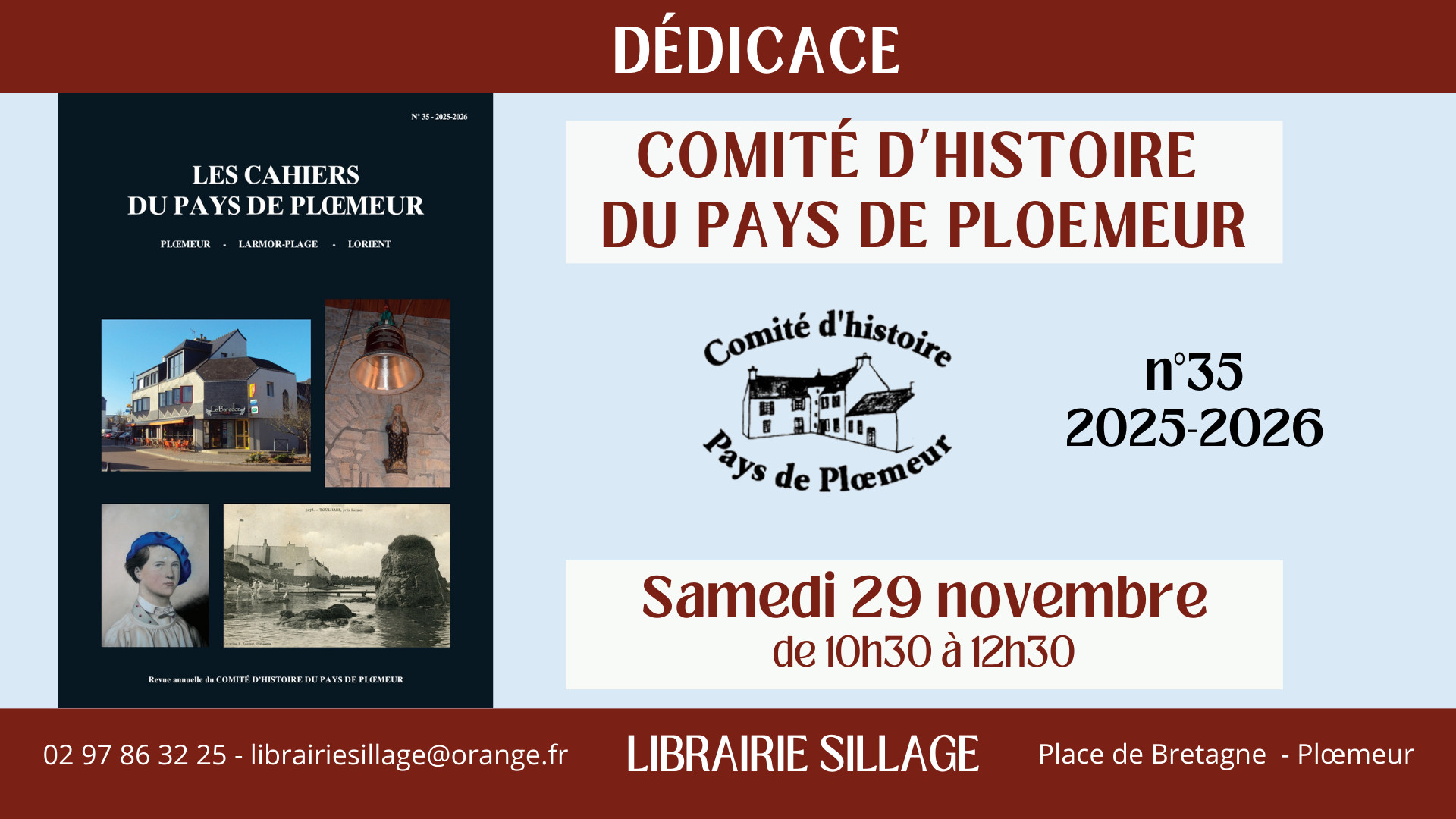 À cette occasion, le comité d'histoire du pays de Ploemeur est présent pour le dédicacer samedi 29 novembre entre 10h30 et 12h30 à la librairie Sillage à Ploemeur.