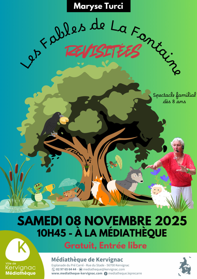 Un spectacle unique et drôle dans lequel Maryse TURCI, conteuse, revisite les fables de La Fontaine à sa sauce : "Le loup et l'agneau" est racontée façon cantine scolaire et "Le lièvre et la tortue" sous la forme d'un commentateur sportif. Une manière truculente et décalée de (re)découvrir ces classiques ! Dès 8 ans.